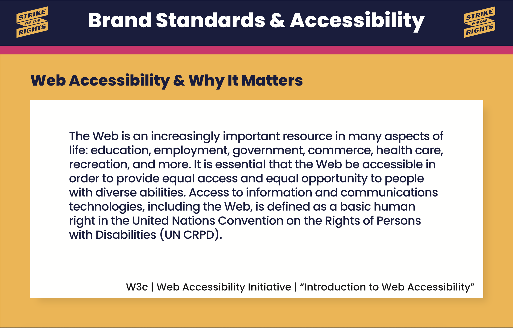 Slide Body: The Web is an increasingly important resource in many aspects of life: education, employment, government, commerce, health care, recreation, and more. It is essential that the Web be accessible in order to provide equal opportunity to people with diverse abilities. Access to information and communications technologies, including the Web, is defined as a basic human right in the United Nations Convention on the Rights of Persons with Disabiliites (UN CRPD). — W3c | Web Accessibility Initiative | “Introduction to Web Accessibility”