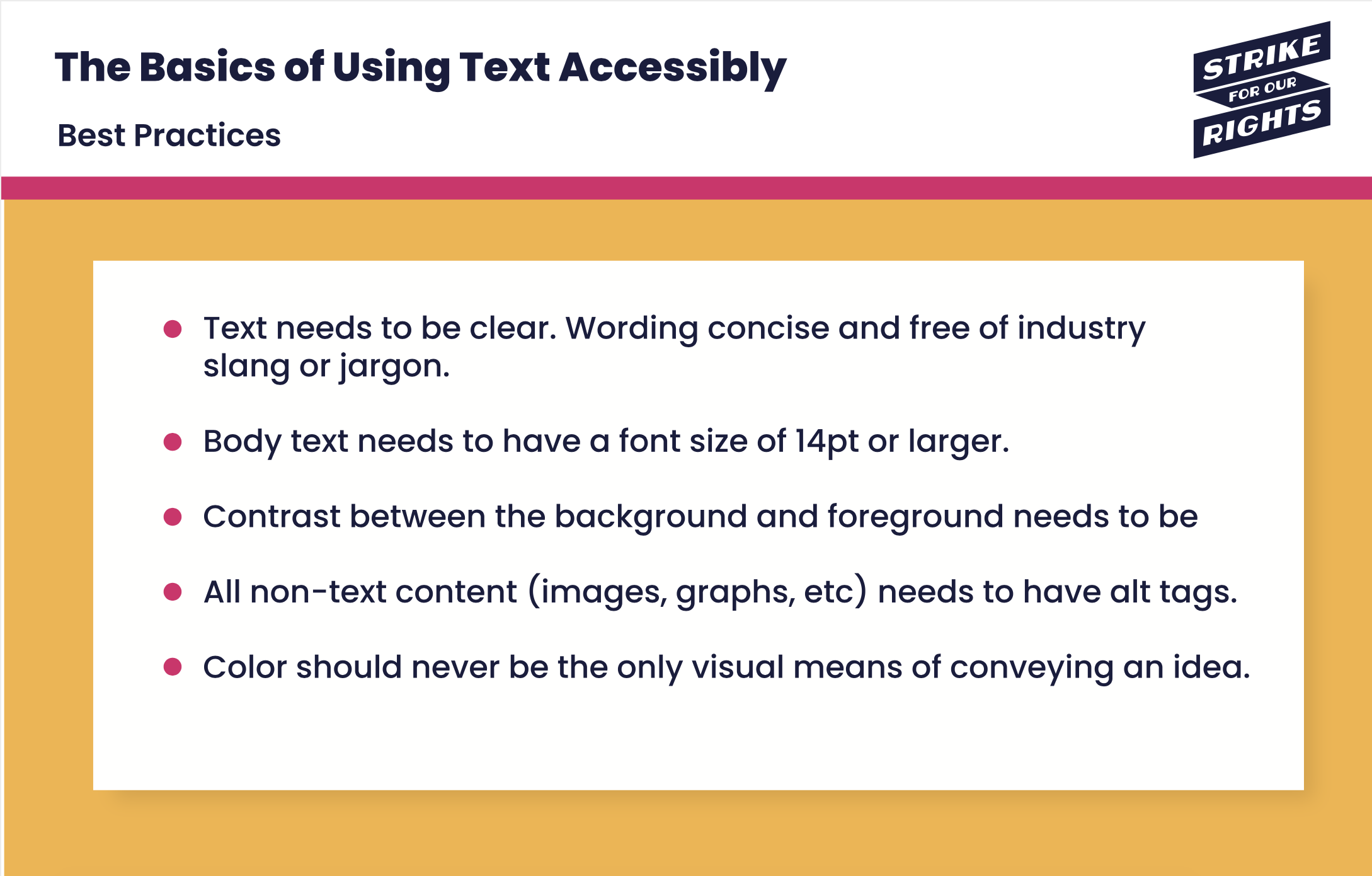 Text needs to be clear. Wording concise and free of industry slang or jargon.